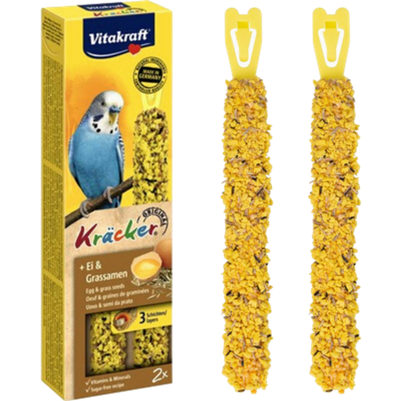 Supergod og populær aktivitet med viktige vitaminer og mineraler. Frøkjeks med egg. Populære kjeks med verdifulle frø lover ren smak og er en velkommen variasjon på undulatenes meny. Den deilige kornblandingen er bakt i tre lag på naturlig tre. Dette gir fuglene en ekstra lang artsvennlig glede, ettersom dyrene jobber for sin egen mat som i naturen. Å gnage på treverket på innsiden bidrar til å pleie nebbet. Vitakraft Cracker Egg