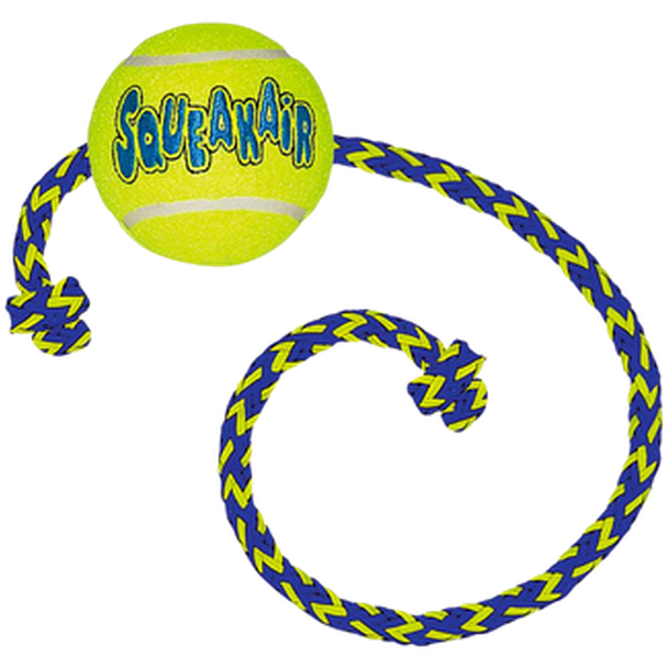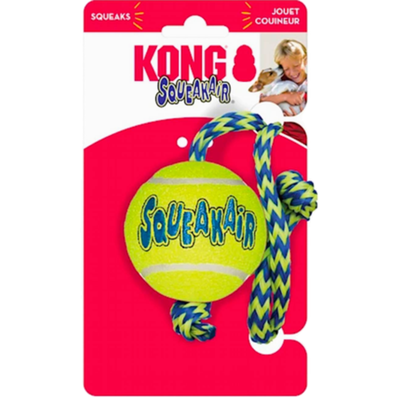 Tennisball - Kong Air Dog Squeakers Ball Dog Toy Rope kombinerer tennisballen og pipeleken som er to klassiske hundeleker - med et ekstra tau for å skape den perfekte apporteringsleken. Kongs holdbare AirDog Squeakair-ball av høy kvalitet gnager ikke på hundens tenner. Kong Air Dog Squeakers Squeakers Ball Dog Toy Rope er laget av et spesielt, slitesterkt tennismateriale. Kong Air Dog Squeakers Squeakers Ball Hundeleketøy Tau