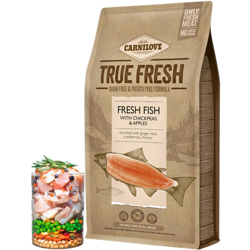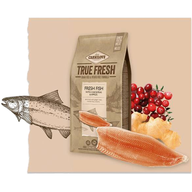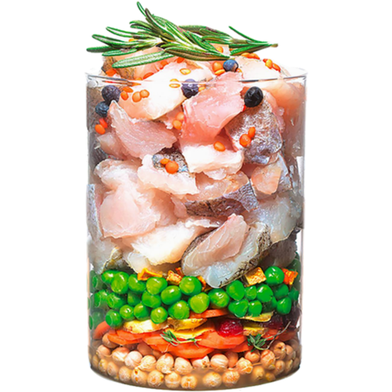 Fersk fisk (60 %), erter, kyllingfett (konservert med tokoferoler), kikerter (4 %), tørkede epler (4 %), røde linser, gresskar, lakseolje (3 %), naturlige aromaer, gulrøtter, tørkede eggeskall, andeprotein (0,5 %), spirulina (0,3 %), tørket havtorn (0,2 %), tørket ingefær (0,1 %), tørkede blåbær (0,1 %), tørket rosmarin (0,1 %), tørkede tranebær (0,1 %), glukosamin (0,026 %), grønnleppemusling (0,025 %), kondroitinsulfat (0,016 %), ølgjær (kilde til mannanoligosakkarider, 0,015 %), sikorirot (kilde til fruktooligosakkarider, 0,01 %), Mojave yucca (0,01 %)."