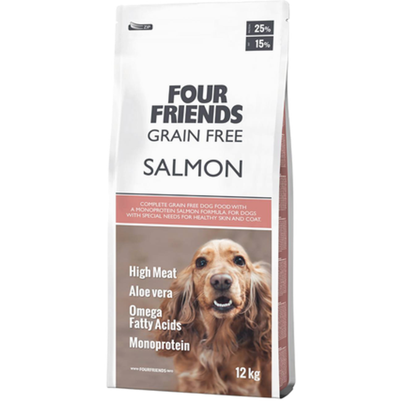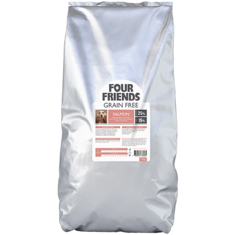 FourFriends Derma Coat-hundefôr har skiftet navn til Four Friends Grain Free Salmon, og har samme innhold som det tidligere Derma Coat-hundefôret med 32 % rent tørket laksekjøtt og poteter som eneste karbohydratkilde. Four Friends Derma Coat inneholder laksekjøtt og lakseolje som er kilder til omega-fettsyrer som har mange gunstige effekter i kroppen. Four Friends Dog Derma Coat