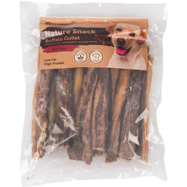 Hundesnacks - naturlige godbiter av bøffelmarsipan. Velsmakende og berikende tyggegodbiter laget av naturlige ingredienser. Perfekt aktivering for hunder som kjeder seg. Den seige tyggemotstanden bidrar til bedre munnhelse ettersom den mekaniske bevegelsen når hunden tygger bidrar til å fjerne plakk og tannstein. Flamingo Dog Nature Snack Buffalo Gullet Round 150g