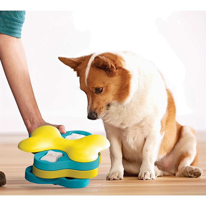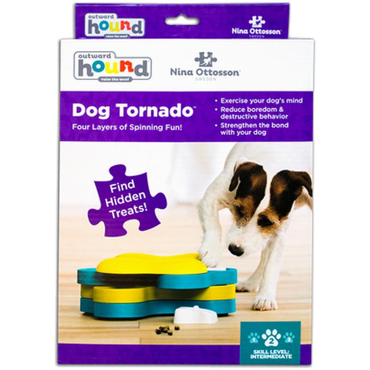 Dog Tornado medium level mataktiveringsspill for hunder med vanskelighetsgrad 2 fra Nina Ottosson by Outward Hound. Legg godbiter eller mat i de ulike rommene. Dekk til noen av rommene med beinformede klosser. Jo flere klosser, desto vanskeligere blir det. Så er leken i gang! Vis hunden din hvordan spillet fungerer, og oppmuntre den til å lete etter godbitene. Hunder er smartere enn du tror, du må bare lære dem hvordan de skal gjøre det! I begynnelsen bør du holde godbitene synlige i bestemte rom, slik at hunden forstår hva leken går ut på. FROZEN PUZZLE: Bland litt kjøttholdig hundemat eller råfôr med vann, klikk litt i hver luke, eller legg en pølse/godbit i hver luke og tilsett litt vann. Legg spillet i fryseren til det er frossent. Perfekt for energiske hunder, i varmt vær eller for en ekstra lang lekeøkt.