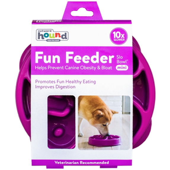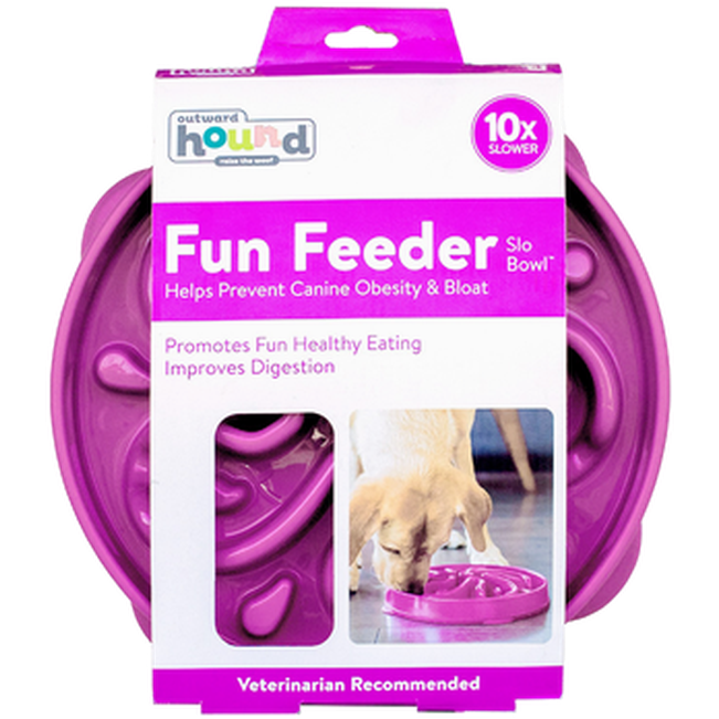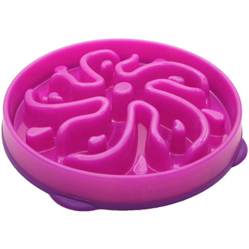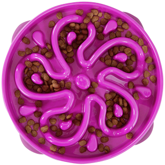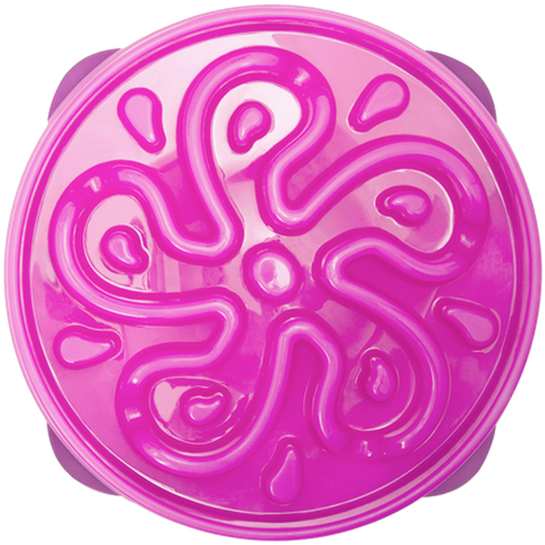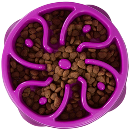 Lilla labyrintskål med blomstermønster til hundemat, både tørrfôr og våtfôr. Matskål for grådige hunder som trenger å spise litt langsommere. Hjernegymnastikk, moro og langvarig fôring i ett. Reduserer risikoen for å svelge luft, hjelper overvektige hunder med å føle seg mette og gir mental stimulering. Outward Hound Slo-Bowl fôringsautomat blomst lilla