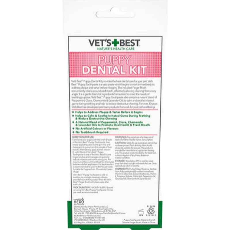 Tannpleie for valper. Tannkremen er utviklet av veterinærer og inneholder en mild, men effektiv blanding av kamille, lavendel, peppermynte og nellik som lindrer irritert tannkjøtt og kløe. Gir frisk pust samtidig som plakk og tannstein reduseres. Valper har ofte et stort behov for å tygge, spesielt når tennene vokser og klør. Gi valpen en morsom leke å tygge på. Det finnes også leker som kan fryses for å gi ekstra lindring. Hundetannkremen har en god smak og vil bli elsket av hunden din. Mild formel som ikke er farlig for hunden å svelge. Vet's Best tannsett for valper