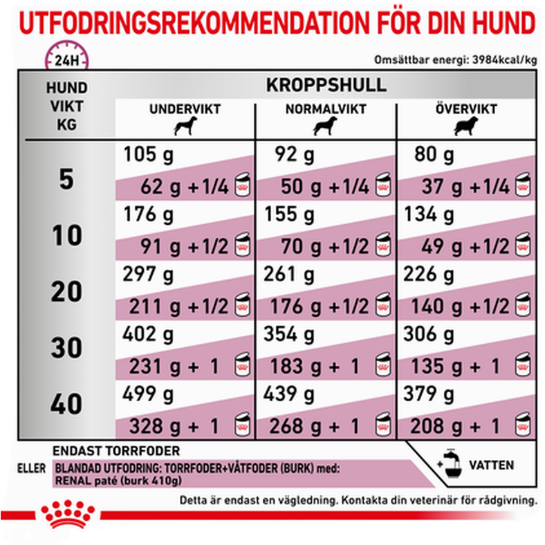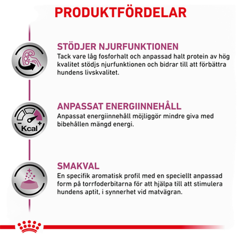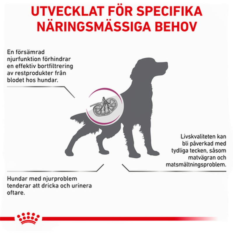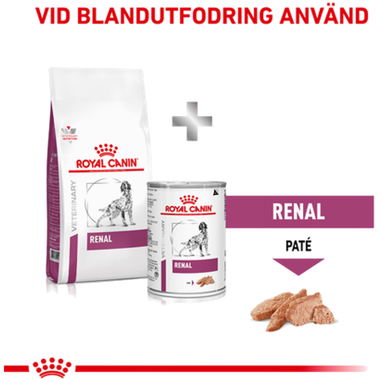 Royal Canin Veterinary Diets Dog Renal veterinærfôr for hunder med nyreproblemer. Hjelper med å kontrollere belastningen på nyrene ved fôring. Rådfør deg alltid med veterinæren din før fôring.