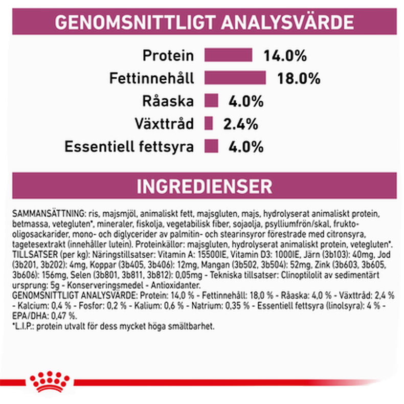Ris, maismel, animalsk fett, maisgluten, mais, hydrolysat av fjørfeprotein, roemasse, hvetegluten*, mineraler, fiskeolje, vegetabilske fibre, soyaolje, psylliumskall og -frø, fruktooligosakkarider, mono- og diglyserider av palmitinsyre og stearinsyre forestret med sitronsyre, ringblomstmel. Proteinkilder: maisgluten (8 %), hydrolysat av fjørfeprotein (4,7 %), hvetegluten (2,5 %).