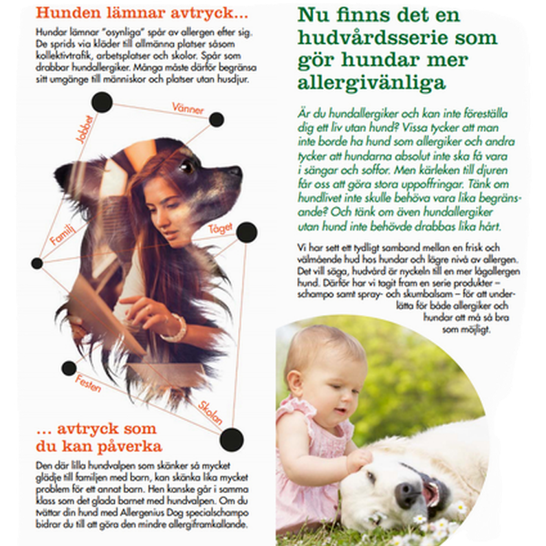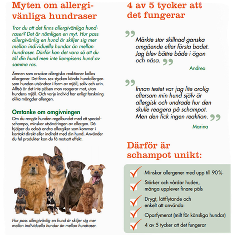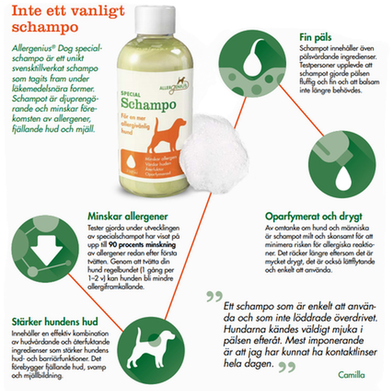 Svensk hundebalsam som kapsler inn allergener, gir næring og fuktighet til hundens hud, reduserer hudirritasjon og styrker hudbarrieren hos hunder. Den reduserer dermed utskillelsen av allergener fra hunden. Allergivennlig hundebalsam utviklet for å redusere allergi mot pelsdyr hos mennesker. Svenskprodusert, uparfymert balsam for hunder reduserer forekomsten av allergener, skjellende hud og flass. Allergenius Dog Special Conditioner Mousse mot pelsallergi. Allergenius® Dog Special Conditioner Mousse for hund