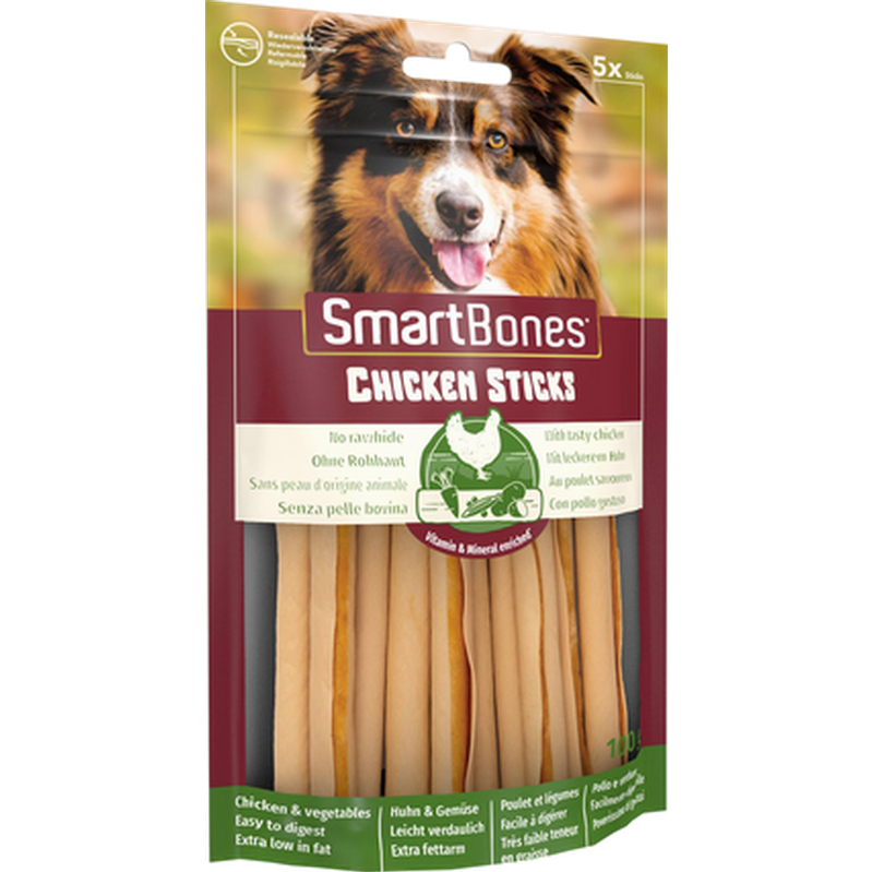 SmartBones® Chicken Sticks er sunne, chewvennlige tyggepinner uten råhud. Det indre laget består av velsmakende kyllingbryst. Kombinert med et ytre lag av deilige grønnsaker - søtpoteter, erter og gulrøtter. En uimotståelig smak som hunden din vil elske! De er beriket med mineraler og vitaminer og er et sunt alternativ til tradisjonelle tyggegodbiter. Bidrar til sunne tenner takket være den naturlige slipeeffekten ved tygging. Med en myk og deilig konsistens. SmartBones Sticks kylling.