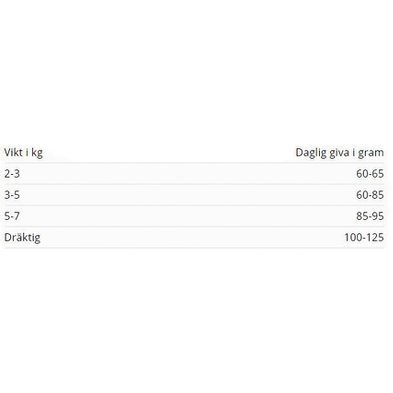Tørket and 25 %, tørket kalkun 20 %, erter, kyllingfett (konservert med blandede tokoferoler), tørket kyllingkjøtt 12 %, tørkede epler, poteter, ølgjær, hydrolysert kyllinglever, lakseolje (1 %), aloe vera (1,5 g/kg), mannanoligosakkarider (150 mg/kg), fruktooligosakkarider (100 mg/kg), yucca schidigera-ekstrakt (80 mg/kg), havtorn (50 mg/kg).