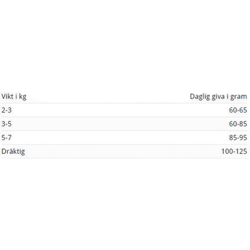 Tørket and 20 %, tørket kalkun 17 %, poteter, erter, tørket kylling 12 %, kyllingfett (konservert med blandede tokoferoler), tørkede epler, hydrolysert kyllinglever, lakseolje (1 %), aloe vera (1,5 g/kg), mannan-oligosakkarider (150 mg/kg), frukto-oligosakkarider (100 mg/kg), yucca schidigera-ekstrakt (80 mg/kg), havtorn (50 mg/kg).