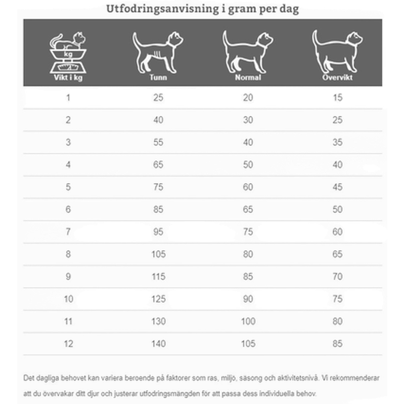 Hvete, maisprotein, fiskeolje, fiskemel, mais, ris, maisstivelse, eggepulver, potetprotein, cellulosepulver, mineraler (inkludert tricaliumcitrat), hydrolysert animalsk protein, vitaminer og sporstoffer (inkludert chelaterte sporstoffer), ammoniumklorid , metylocin, chionylosin, taurin, borageolje , gjær (kilde til mannan-oligosakkarider), L-karnitin.
