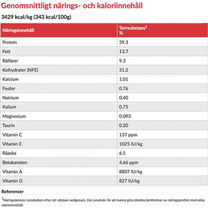 Kylling (23 %) og kalkunmel, bryggeriris, maisglutenmel, cellulose, presset tomat, tørket betemasse, linfrø, animalsk fett, kokosnøttolje, smaksatt buljong, mineraler, L-lysin, DL-metionin, tørkede gulrøtter, L -karnitin, vitaminer, taurin, sporstoffer og betakaroten. Med naturlige antioksidanter (miksede tokoferoler).