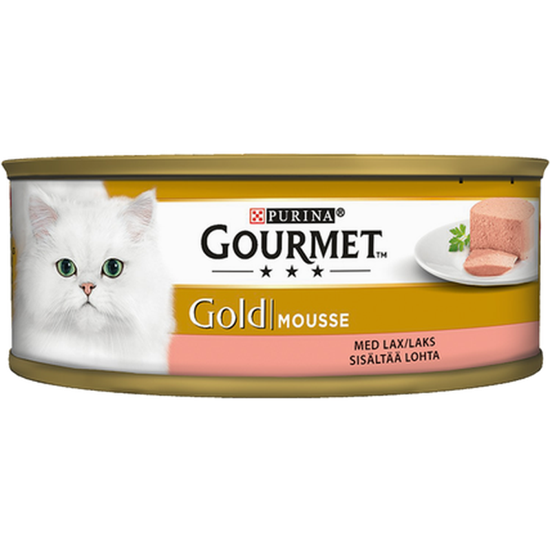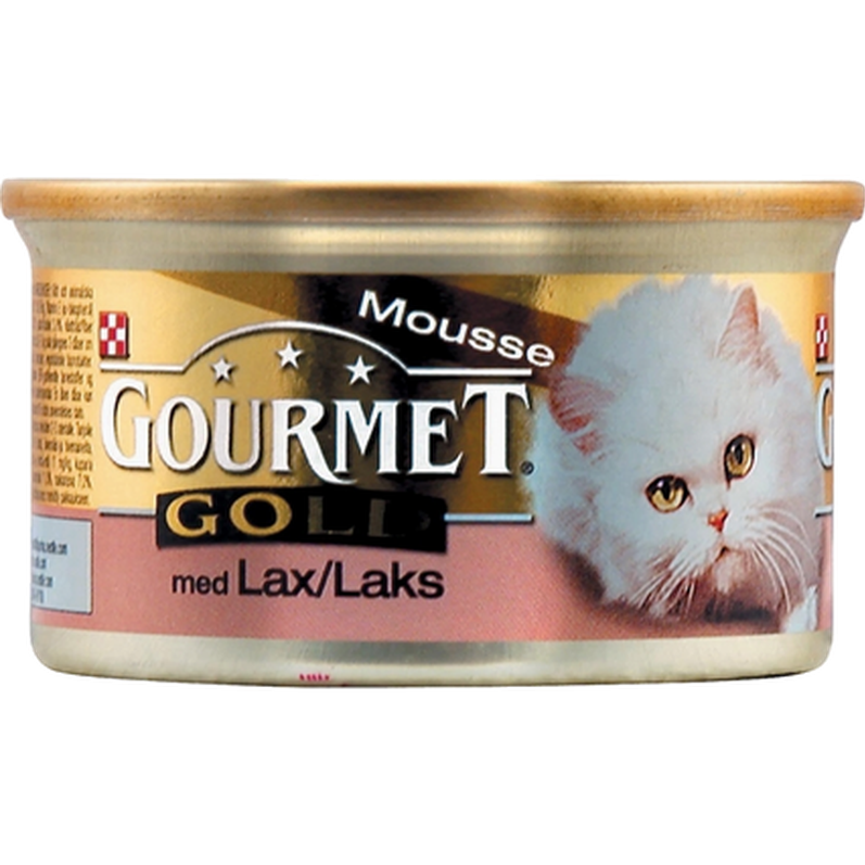 Purina Gourmet Gold laksemousse 85 g - kattemat Gourmet Gold laksemousse på boks. Luftig og deilig laksemousse til katter. Prisgunstig og verdsatt Gourmet Gold Fine kattemat med pate deilige smaker med laks i mousse. Purina Gourmet Gold mousse med laks er et smakfullt kattemat, våtfôret er pakket i små bokser. Purina Gourmet kattemat er tilgjengelig i fem forskjellige smaker.
