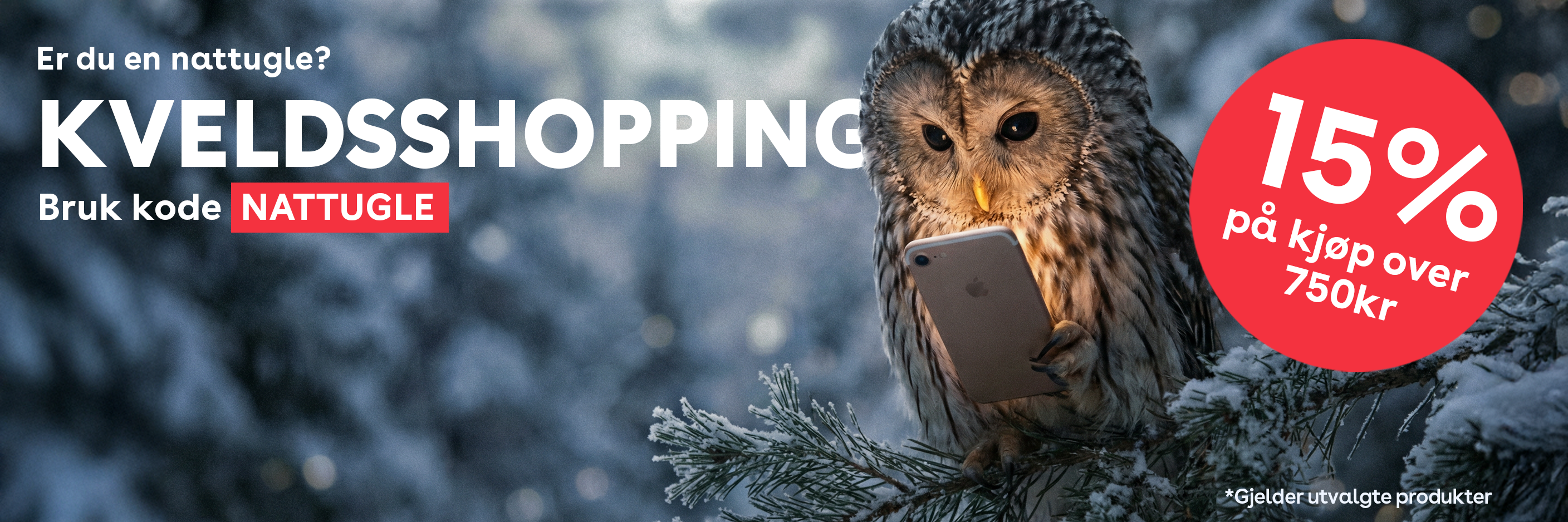 Tilbudet gjelder bare for bestillinger over 750 kr og for produkter merket med etiketten "NATTUGLE 15%". Kan ikke kombineres med andre rabatter eller medlemspriser.