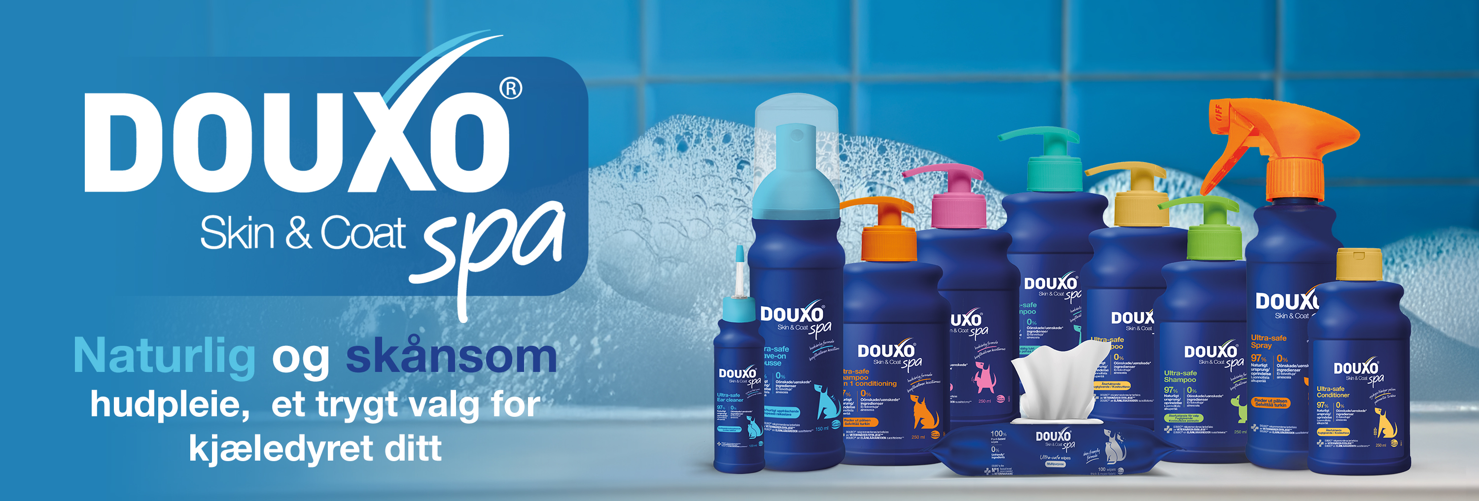 DOUXO® SPA er den perfekte løsningen for enkel, skånsom og behagelig pelspleie for både deg og kjæledyret ditt. Produktene pleier, styrker huden og gir pelsen en vakker glans. Det er derfor ikke rart at de anbefales av både veterinærer og dyreeiere. Med naturlige og kvalitetsrike ingredienser er DOUXO® SPA den ideelle serien for en mild, behagelig og effektiv baderutine som både pleier og rengjør.