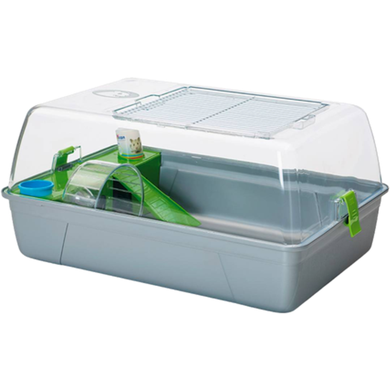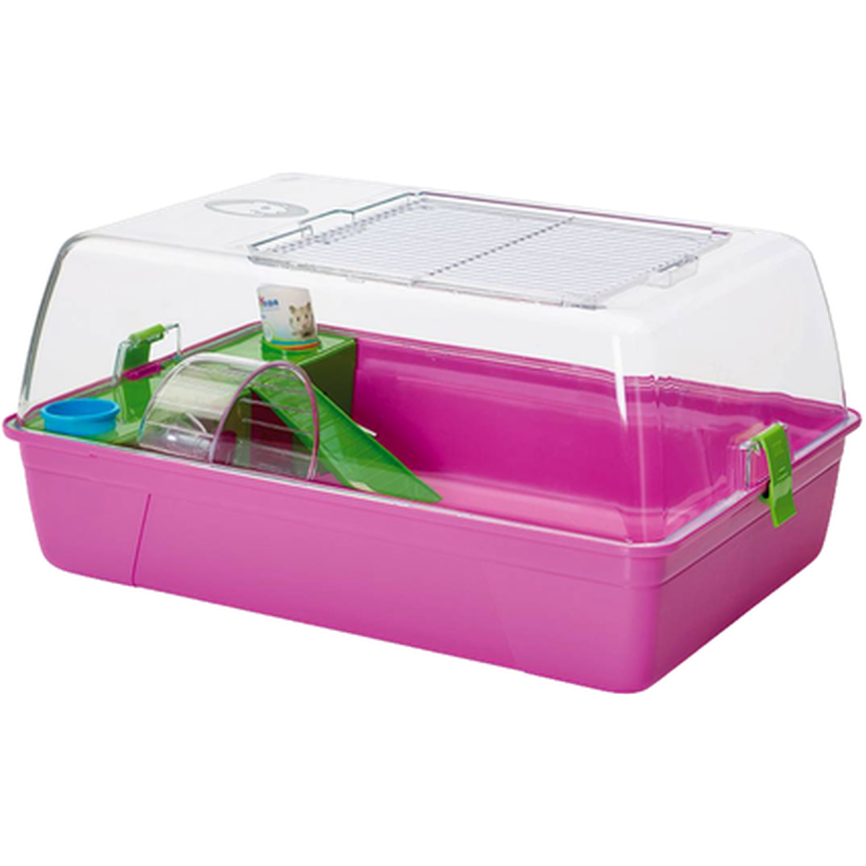 Det perfekte starthjemmet for hamsteren din. Rody Hamster Cage er utstyrt med en stige, en plattform og et løpehjul som sørger for at den lille gnagervennen din har det gøy. Det nye hjemmet leveres også med en matskål og en praktisk drikkeflaske. Toppen og bunnen av buret er laget av plast. Dette gjør at gulvet i buret holder seg ryddig inne i buret, og området rundt buret er rent og ryddig. Metallgitteret på toppen fungerer som inngangsdør og luftsirkulasjon.