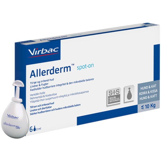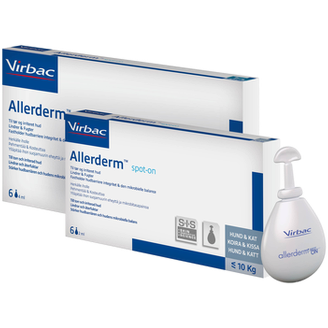 Allerderm Spot on for store og små hunder og katter med midlertidige eller kroniske hudproblemer og reparerer skadet hud. Allerderm kan brukes ved alle hudsykdommer som atopi, hot spot, pyodermi, loppeallergi, demodikose m.m. Virbac spot-on stikkpiller pleieløsning for hund og katt. Spot On påføres direkte på det skadede dyrets hudområder for å beskytte huden og gjenoppbygge den normale hudbarrieren. Virbac Allerderm Spot On
