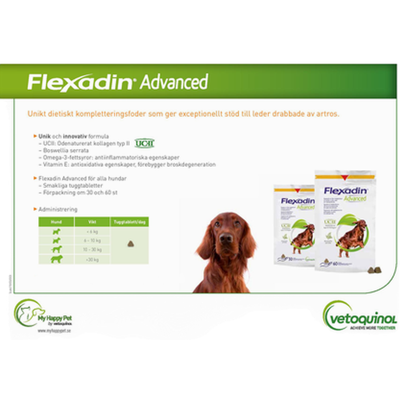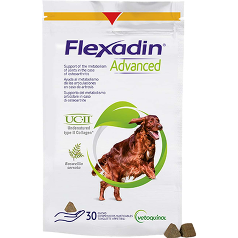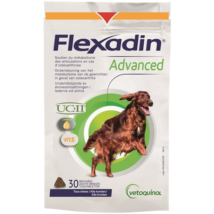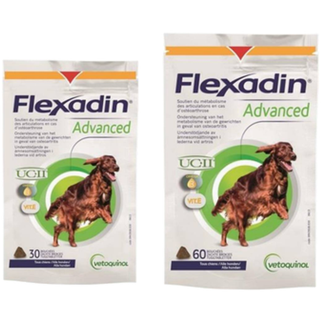 Flexadin Advanced med 30-60 smakstilsatte tyggetabletter for å støtte leddene til hunder med artrose. Vetoquinol Flexadin Advanced med UCII (undenaturert kollagen type II), omega-3-fettsyrer som forebygger nedbrytning av brusk og vitamin E som har betennelsesdempende egenskaper.
